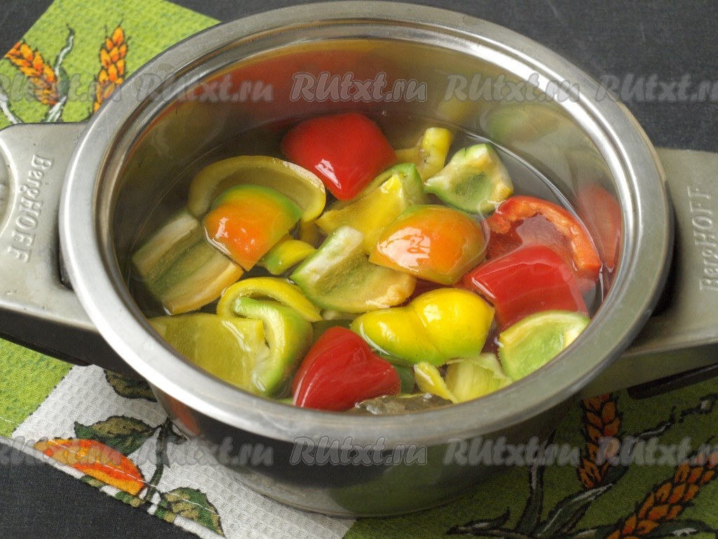 Далее оставшийся перец выложить в кастрюлю с маринадом, варить 1-2 минуты с момента закипания, затем переложить его в банку, наполняя её до верха. Маринад довести до кипения и залить его в банку по самое горлышко.