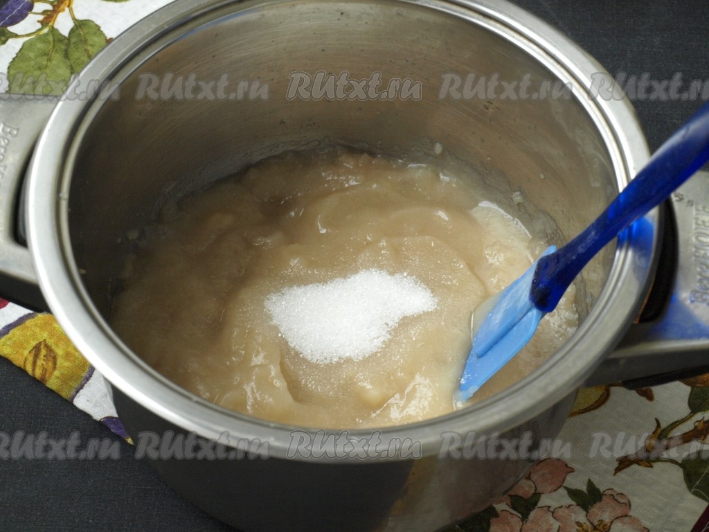 Добавить в кастрюлю сахар, хорошо перемешать и варить яблочно-грушёвое пюре на небольшом огне ещё 3 минуты с момента закипания, помешивая.