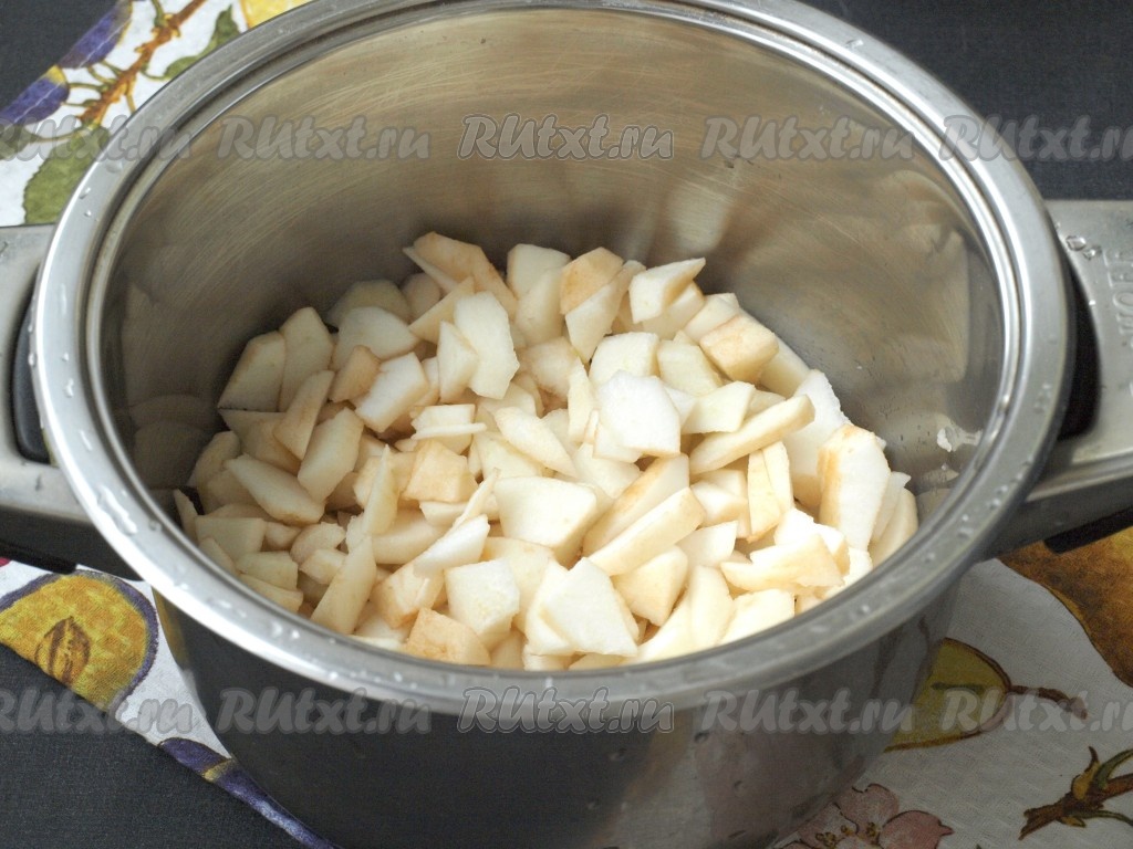 Груши и яблоки очистить от шкурки, разрезать накрест и удалить сердцевины.