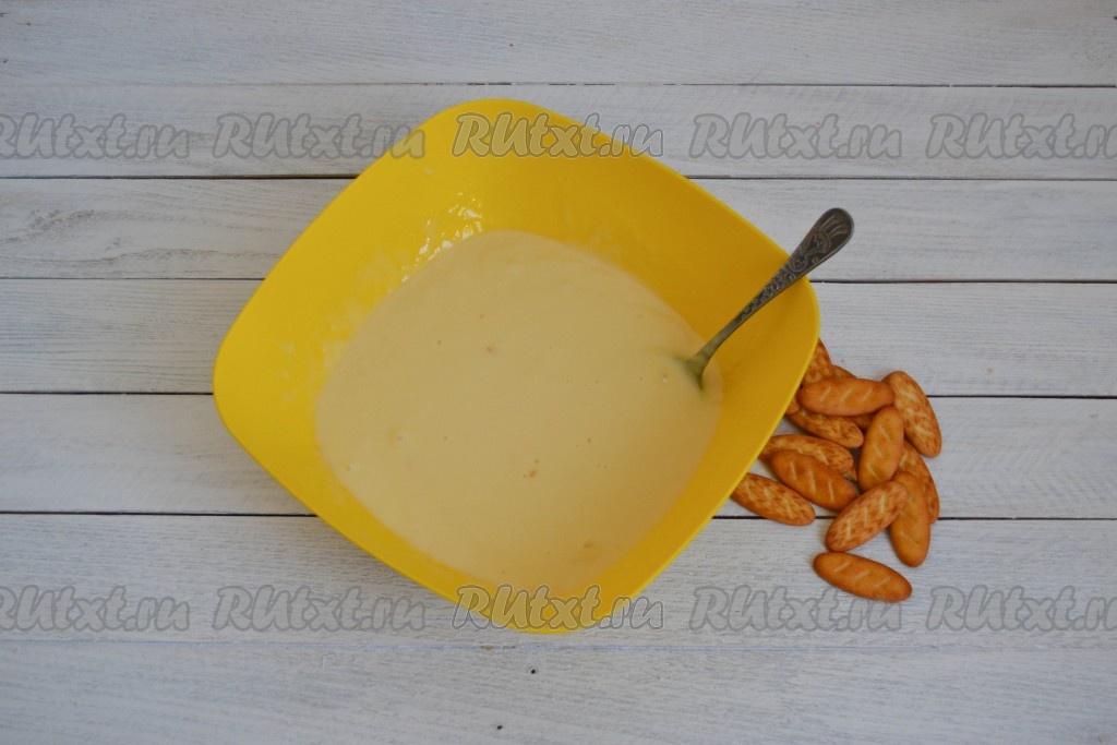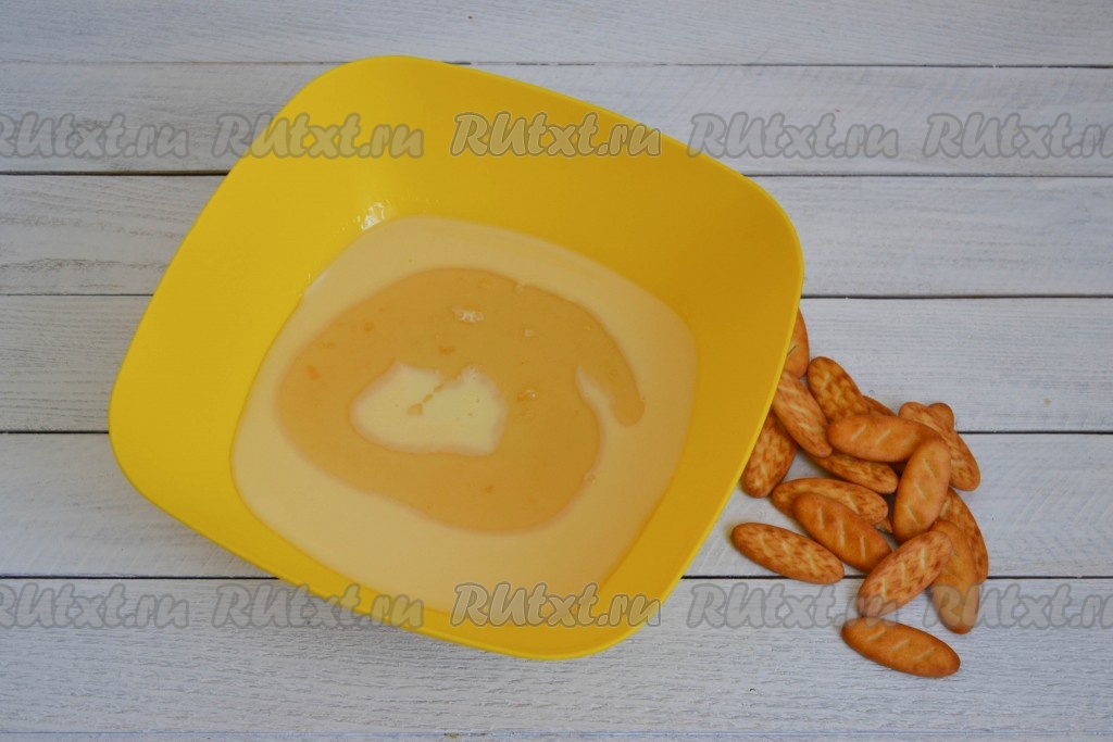 Тщательно перемешать сгущенку с желатином, должна получиться однородная масса. Делать это нужно очень быстро, иначе тяжело будет переместить получившуюся массу в форму с крекерами.