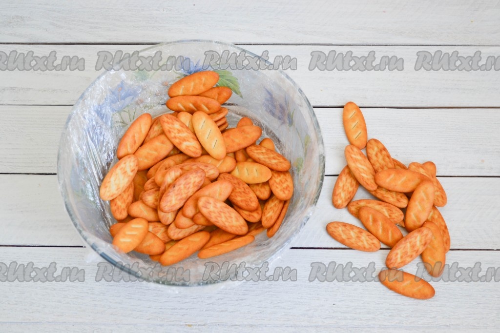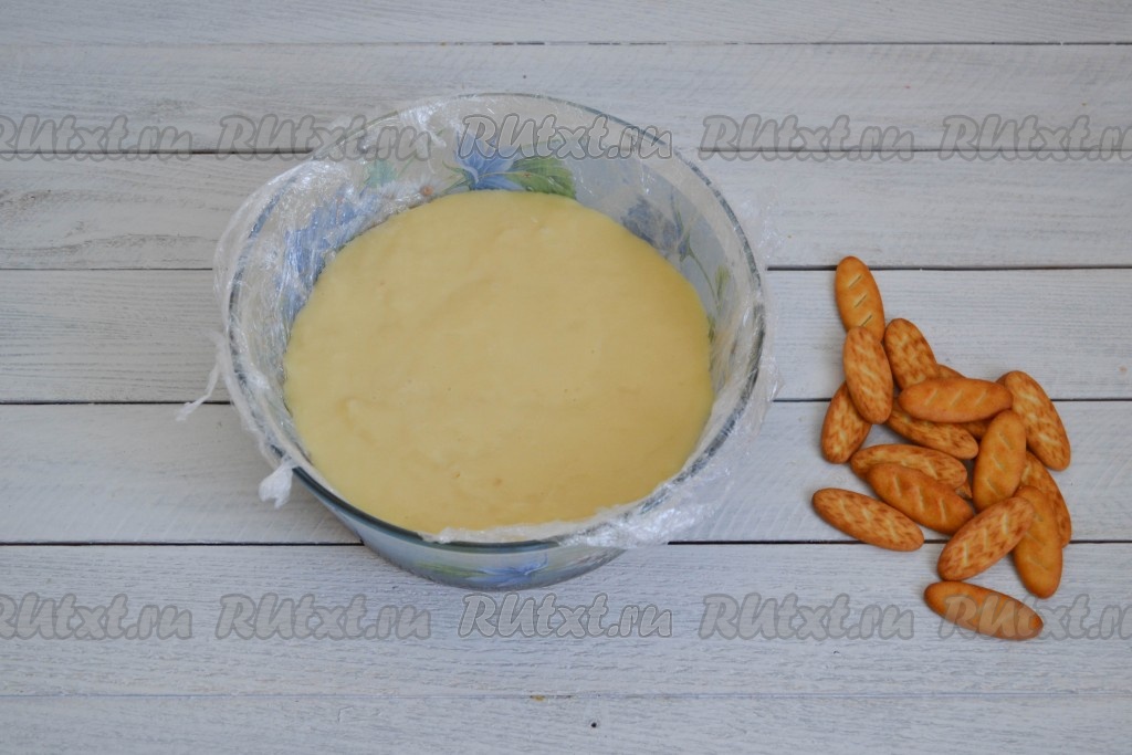 Для формирования торта подойдет любая форма: глубокая или широкая, силиконовая или стеклянная. Если используете не силиконовую форму, то, для того чтобы торт было удобно извлекать из формы, форму лучше застелить пищевой пленкой. Выложить в форму 2/3 крекера.