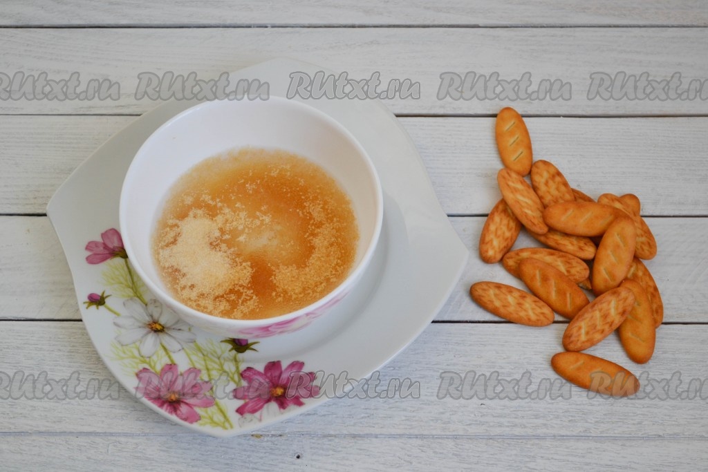 Желатин залить горячей водой и оставить на 15 минут для набухания. Затем отправить на слабый огонь и, помешивая, довести до полного растворения. Не кипятить!