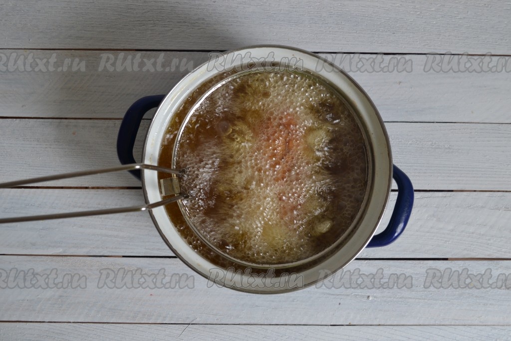 Снизить огонь к минимуму и выложить курицу во фритюр.