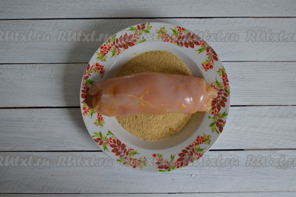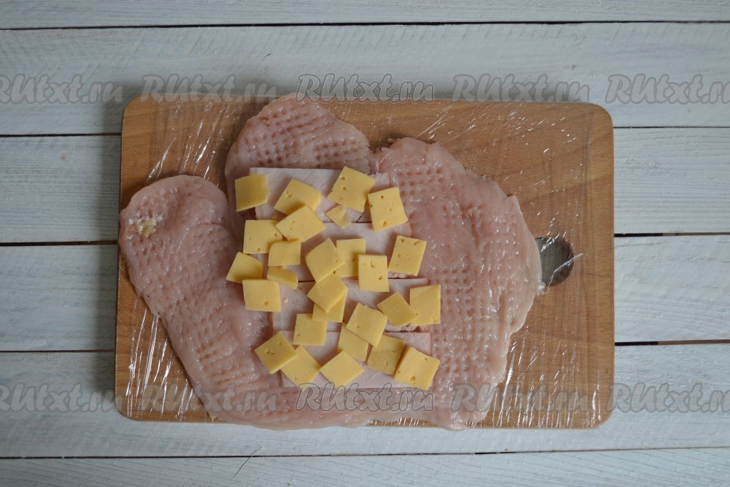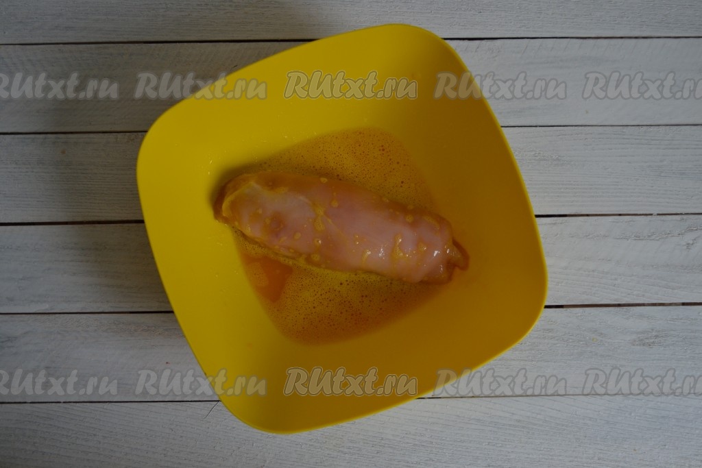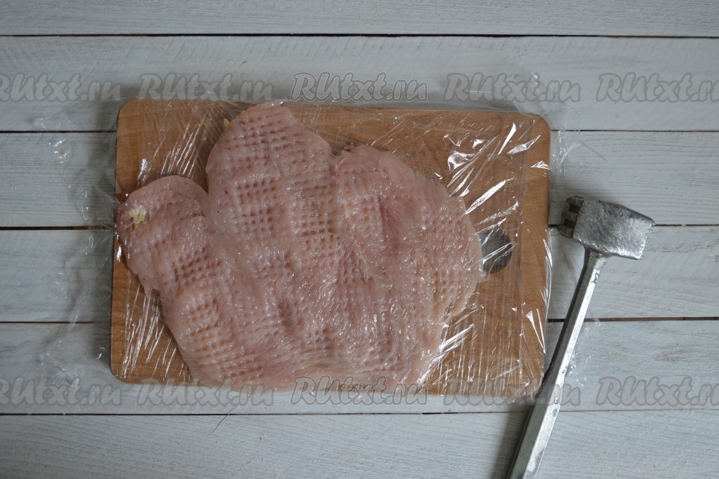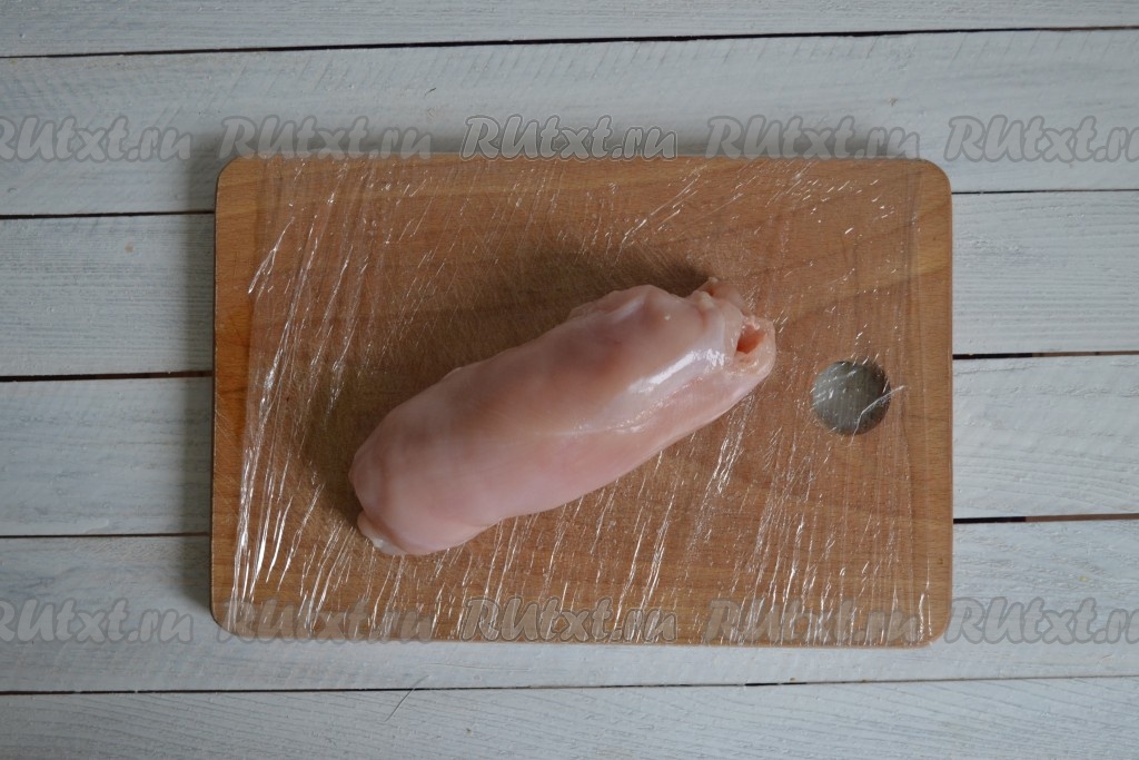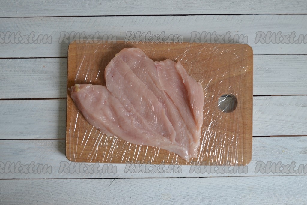 Куриное филе необходимо вымыть, зачистить от пленок и жира. Разрезать вдоль и открыть, как книгу.