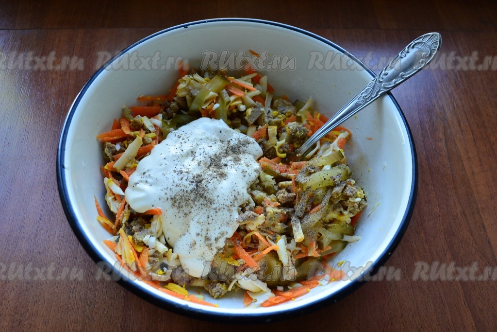 Салат посолить по вкусу, щедро поперчить, добавить майонез и хорошенько перемешать.