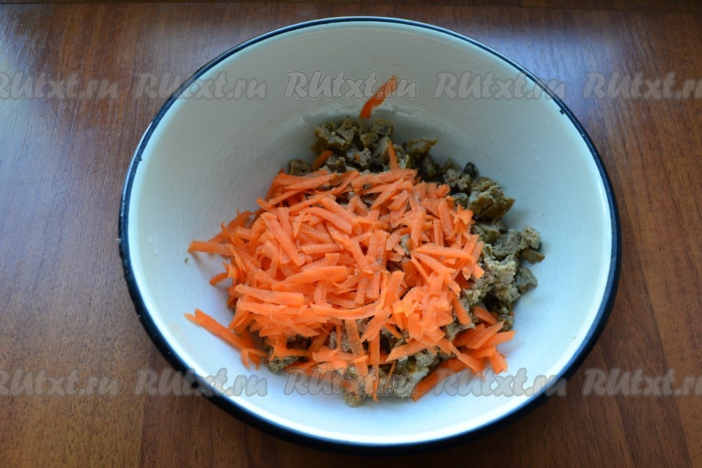 Заранее сварить вкрутую яйцо (на отваривание с момента закипания воды потребуется минут 9-10), затем остудить его и очистить. Куриную печень промыть и отварить в течение 15 минут с момента закипания воды, затем достать из воды и остудить. Нарезать печёнку на небольшие кусочки (или натереть на крупной тёрке), выложить в миску, добавить очищенную сырую морковь, натёртую на крупной тёрке.