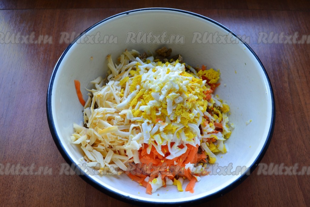 Очищенное яйцо натереть на крупной тёрке и выложить в салат из печени и моркови. Сюда же добавить натёртый на крупной тёрке сыр.