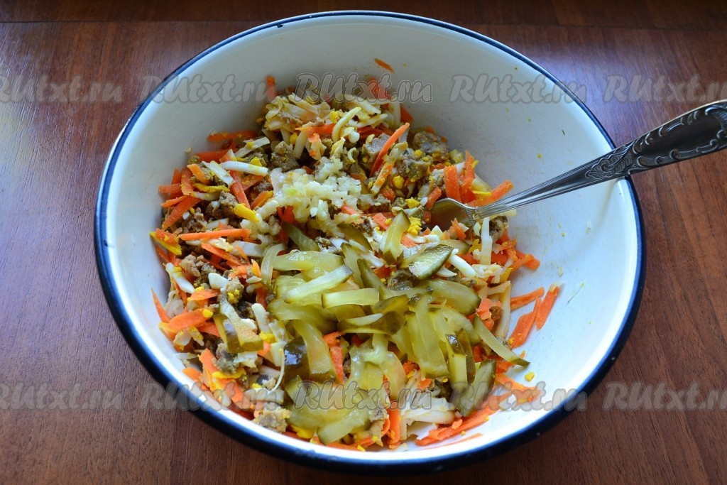 Солёный (или маринованный) огурец нарезать тонкой соломкой (или брусочками), добавить в салат.