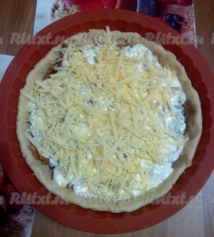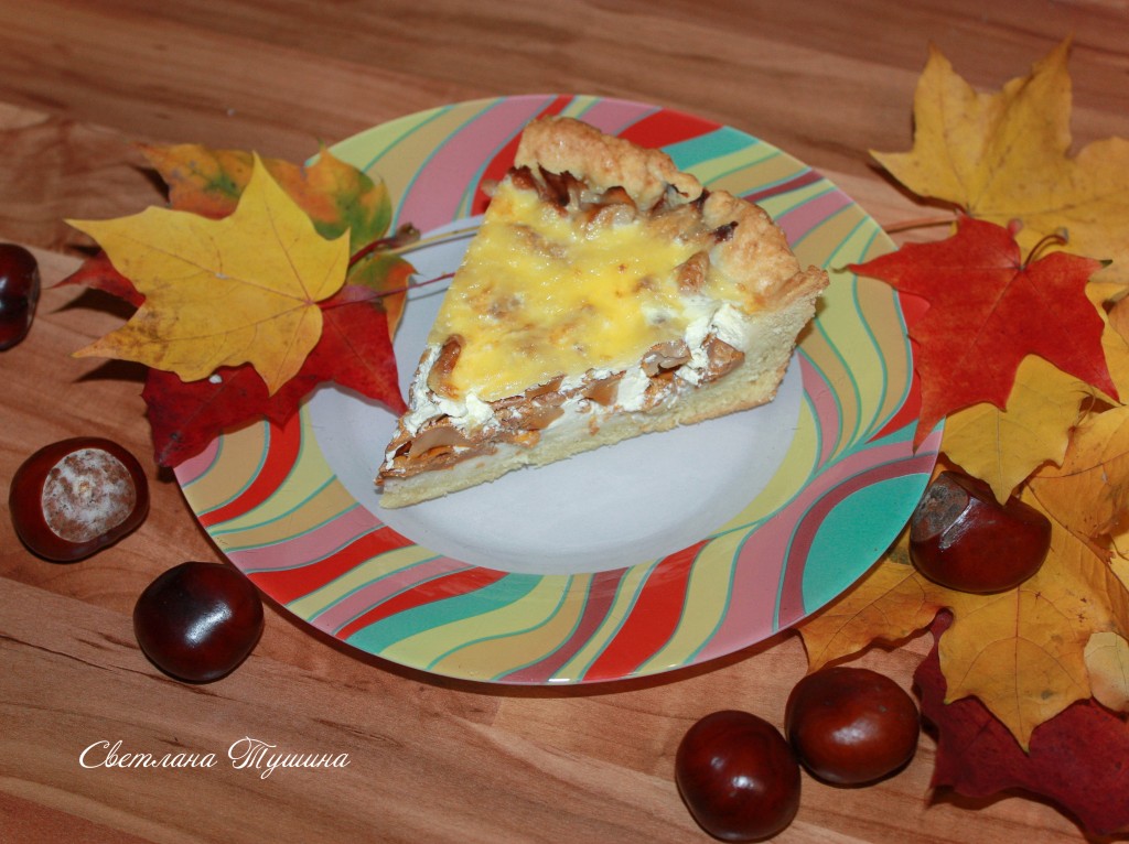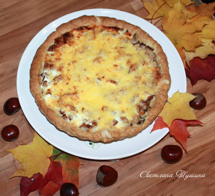 Форму с пирогом отправить в предварительно разогретую до 180 градусов духовку на 30-40 минут. У меня открытый заливной пирог с лисичками выпекался 30 минут.