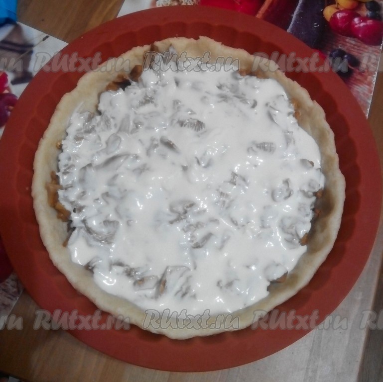 Для приготовления заливки сметану слегка взбить с яйцом, немного посолить, добавить любимые специи и зелень при желании. Залить сверху грибы.