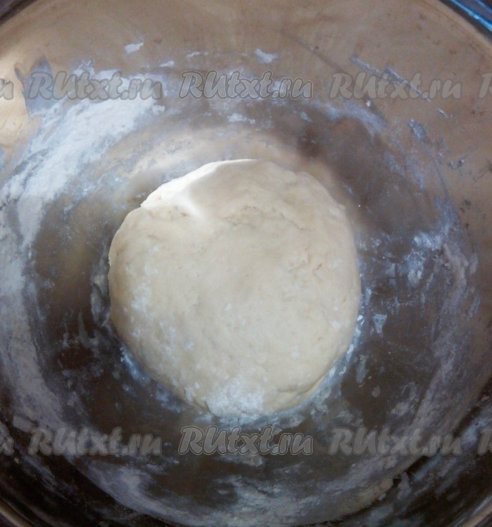 Яично-сметанную массу влить в муку с маслом и замесить тесто. Если муки немного не хватило, то добавить. Тесто должно быть гладким и не приставать к рукам. Готовое тесто убрать в холодильник на 30 минут.