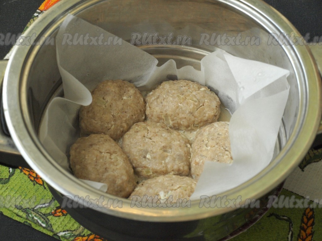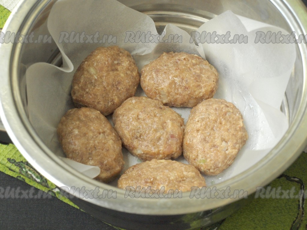 Пекарскую бумагу совсем немного смазать растительным маслом, выложить в пароварку, сверху разложить котлеты (я готовила рыбные котлетки в два захода).