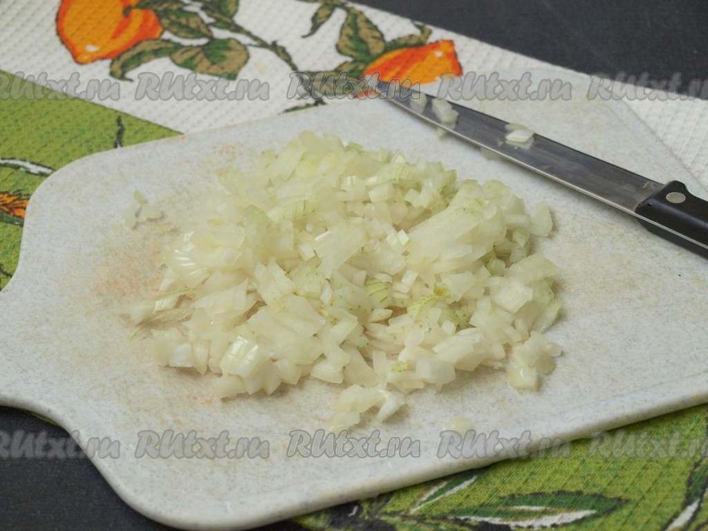 Для приготовления фарша свежую или предварительно размороженную рыбу нужно тщательно отделить от кожи, хребта и костей, пропустить через мясорубку или перекрутить в комбайне. Нам понадобится 400 грамм рыбного фарша. Фарш у меня приготовлен из речной рыбы. Можно, конечно, взять и покупной фарш. Очищенную луковицу мелко нарезать (можно перекрутить в комбайне или мясорубке).
