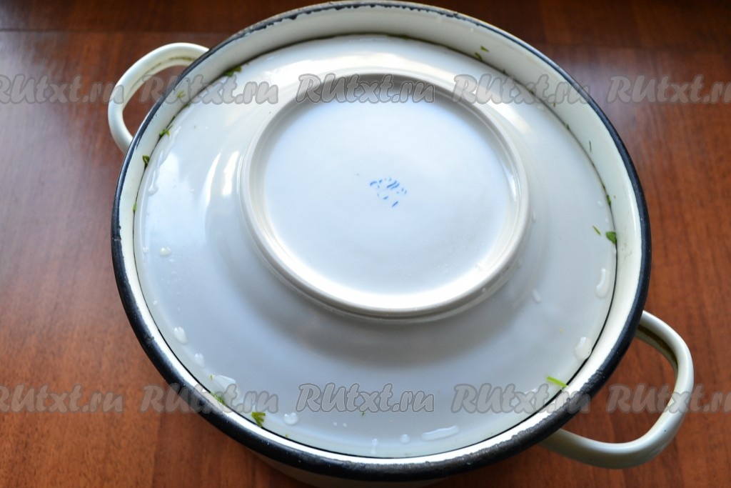 Сверху накрыть помидоры меньшей по диаметру, чем кастрюля, тарелкой и поставить гнет.
