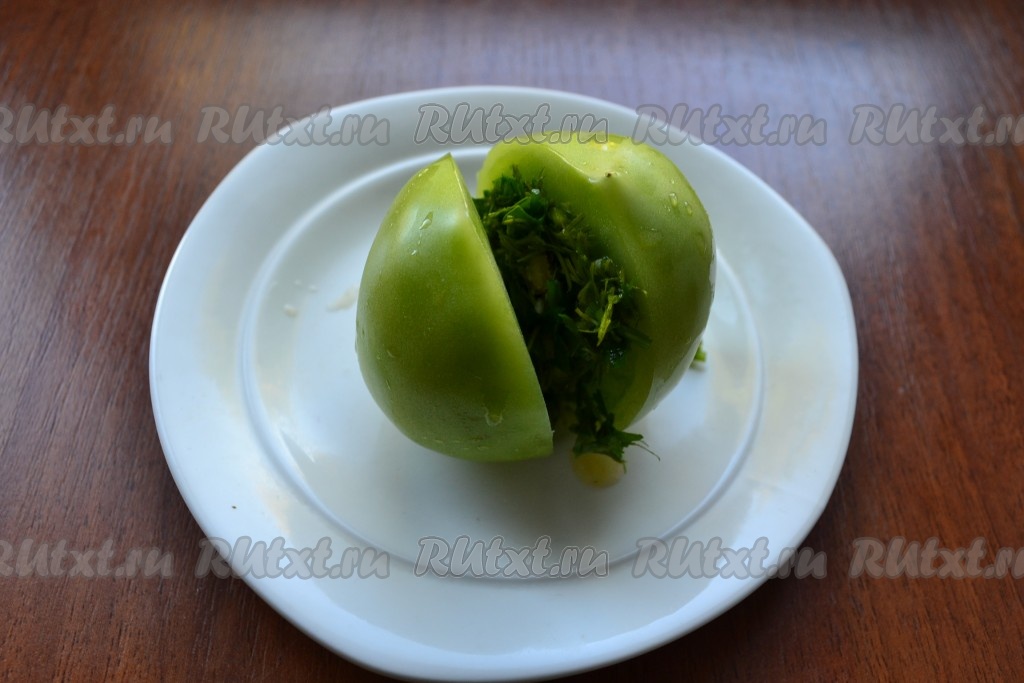 Каждый помидор надрезать пополам не до конца, заполнить разрез подготовленной массой из зелени и чеснока.