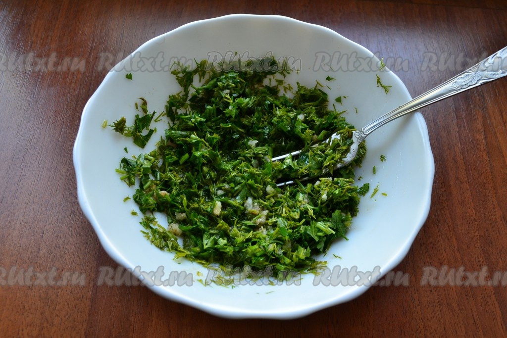 Измельчить или прокрутить на мясорубке зелень петрушки и укропа, добавить пропущенный через пресс чеснок и красный молотый перец (или измельченный чили).