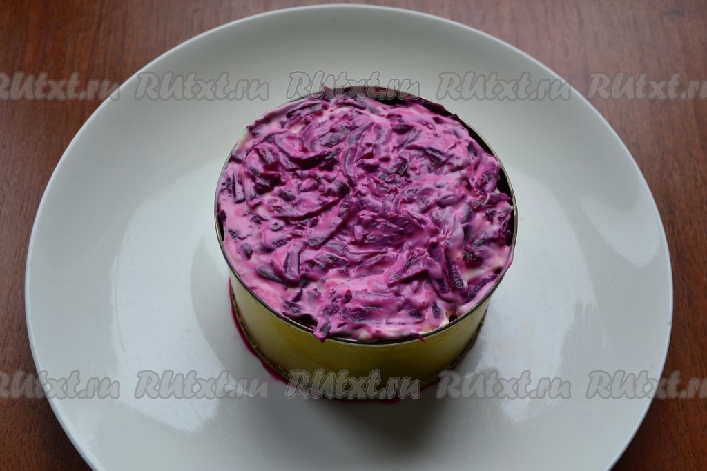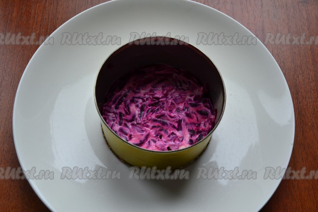 И последним слоем выложить оставшуюся свеклу, смешанную с чесноком и майонезом.
