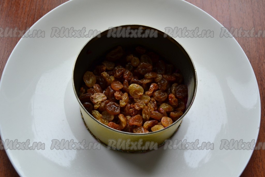 Вторым слоем выложить предварительно замоченный в кипятке на 10 минут, а затем отжатый изюм.