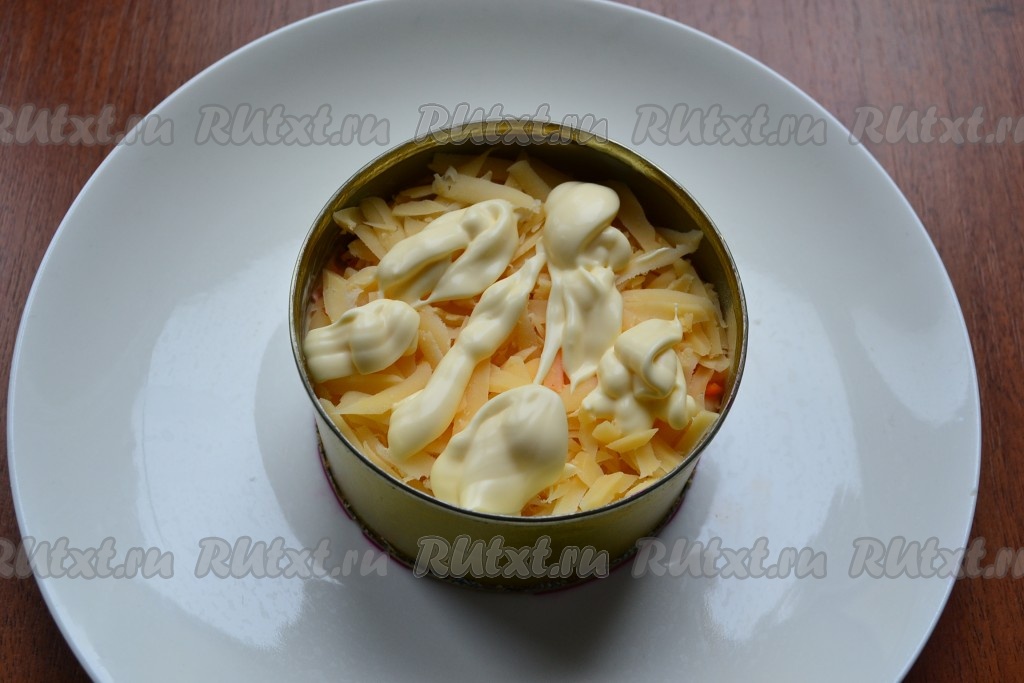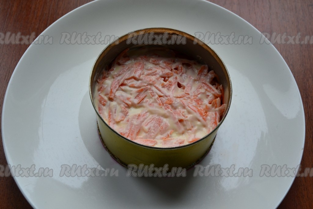 Далее разместить слой натертой на средней терке свежей моркови, смазать майонезом.