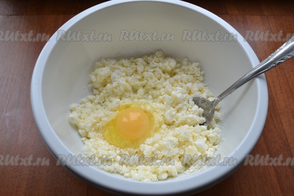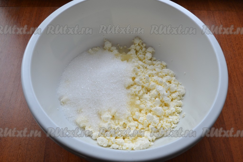 К творогу добавить 100 грамм сахара и щепотку соли.