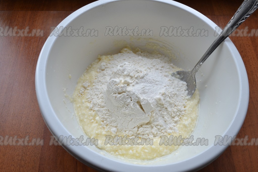 Добавить разрыхлитель с половиной муки.