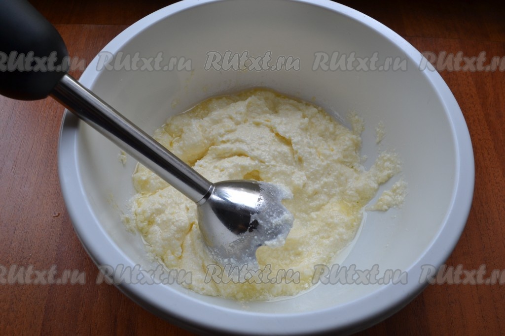 Получившуюся смесь взбить погружным блендером до нежной творожной массы.