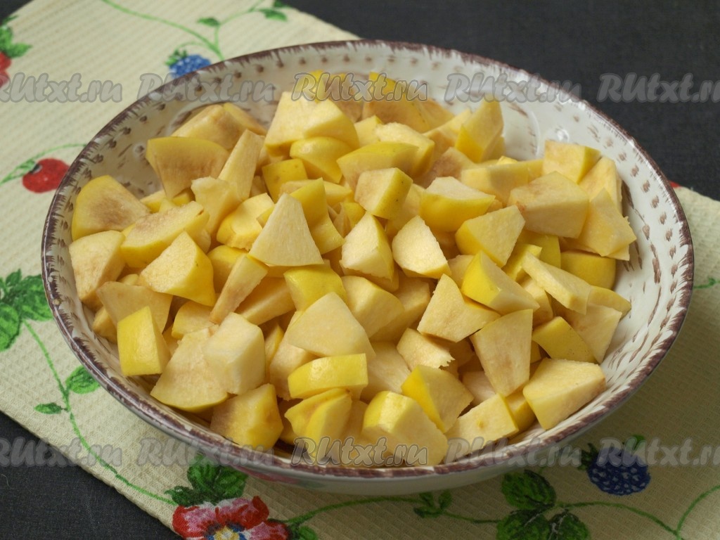 Айву тщательно вымыть, удаляя на плодах ворсистый налёт. Разрезать плоды пополам и удалить семена, затем нарезать айву на небольшие кусочки.
