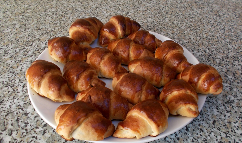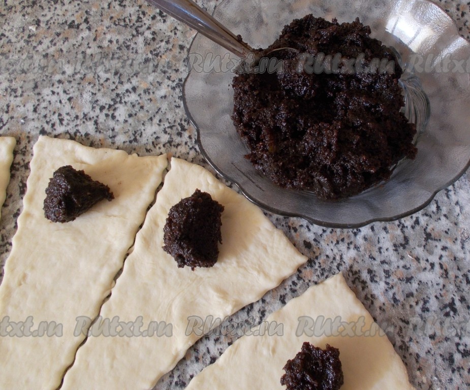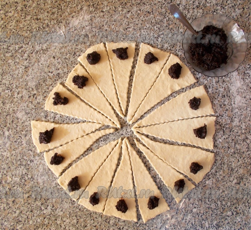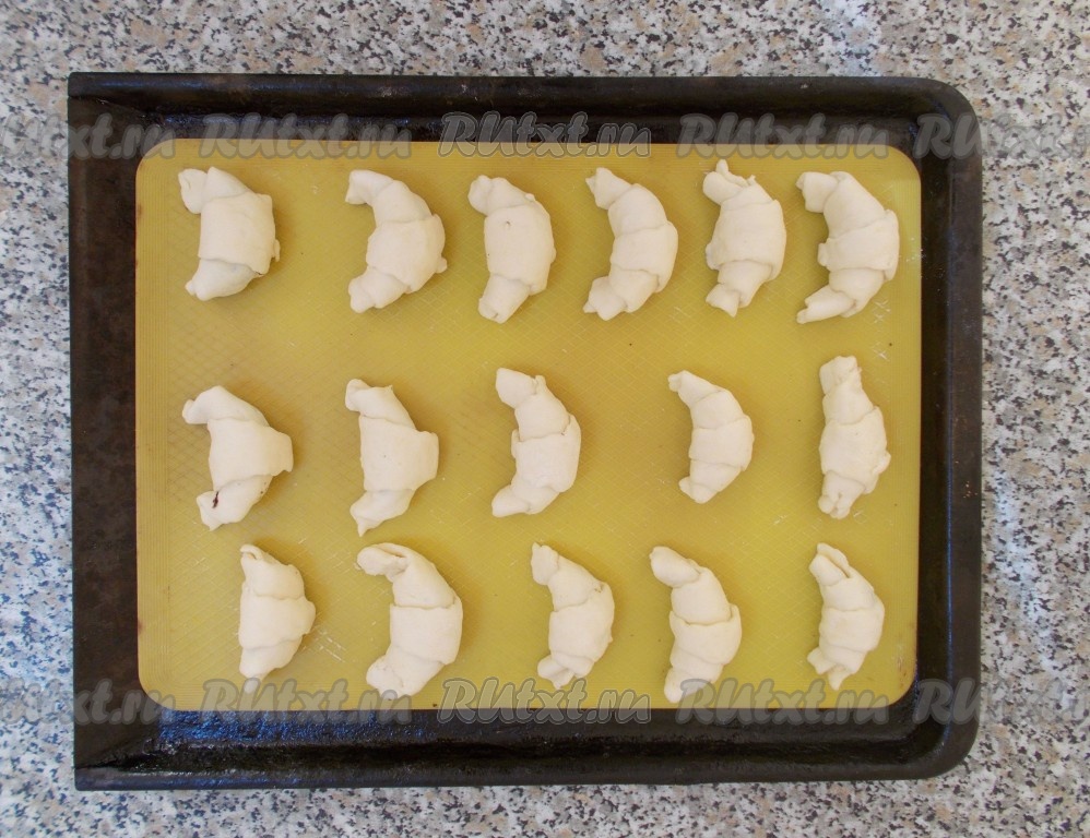Каждый треугольничек скатываем и формируем рогалики, слегка изгибая концы в виде полумесяца. Укладываем рогалики на противень с силиконовым ковриком (очень удобно пользоваться этими ковриками, поскольку изделия при выпечке к нему не прилипают и нет необходимости дополнительно смазывать маслом, если у вас такого коврика нет – можете использовать бумагу для выпечки, но тогда смажьте её маслом). Пусть они так полежат 20 минут при комнатной температуре, чтобы согрелось тесто. Можно рогалики смазать перед выпечкой взбитым яйцом, а можно не смазывать - если готовые рогалики хотите посыпать сахарной пудрой. Но имейте ввиду, посыпать пудрой нужно обязательно горячие рогалики! Выпекать рогалики с маковой начинкой в разогретой духовке при температуре 180 градусов до золотистого цвета (примерно, 20 минут).