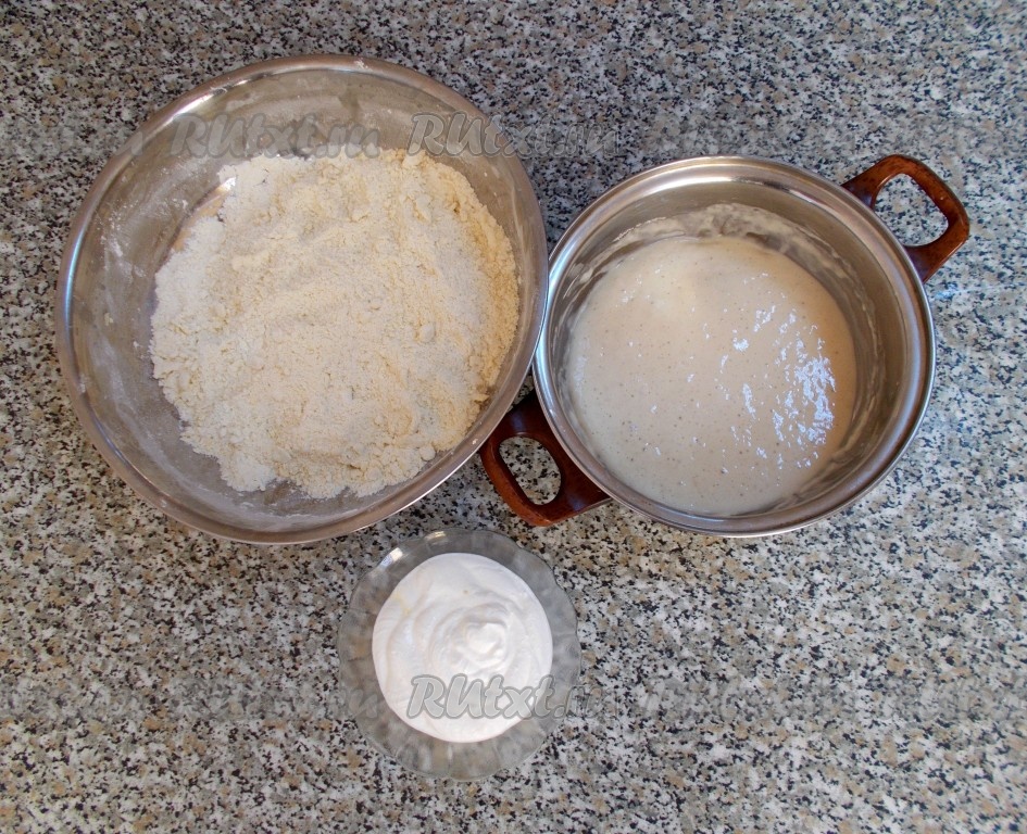 Муку просеиваем, перемешиваем с оставшимся по рецепту сахаром и растираем с размягченным маргарином. Добавляем туда же сметану и подошедшую опару.