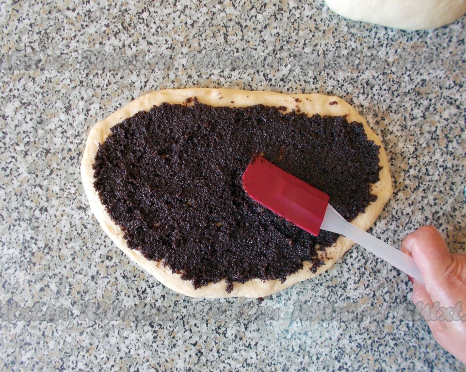 Равномерно распределяем маковую начинку по тесту с помощью силиконовой лопатки (ножа или ложки). Сворачиваем в рулет, плотно прижимая тесто.