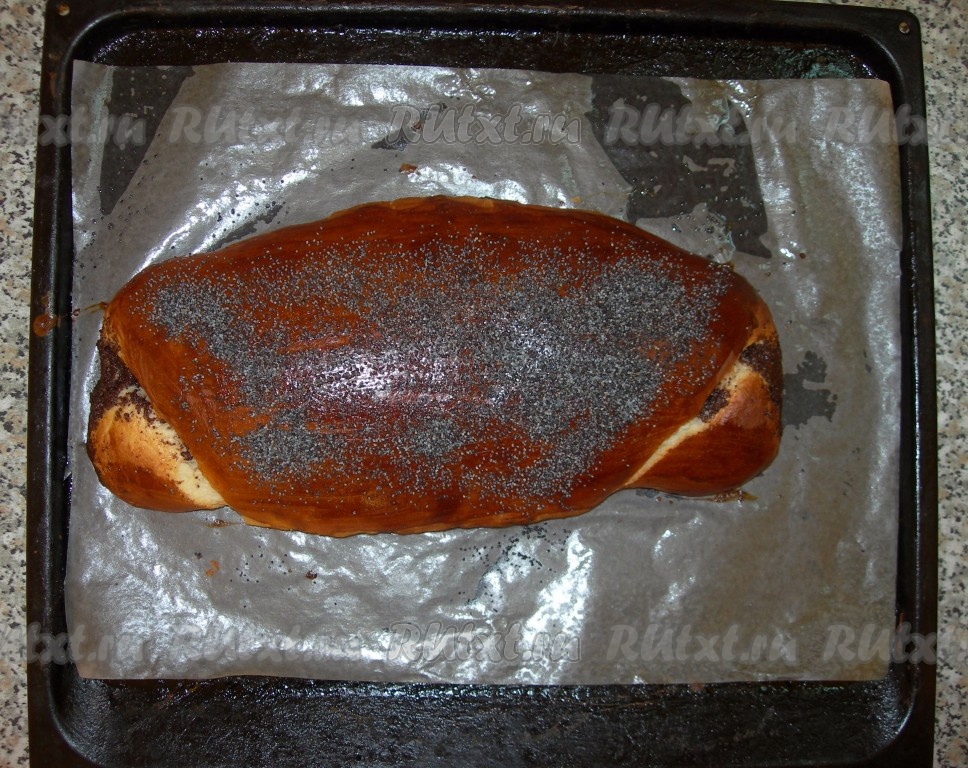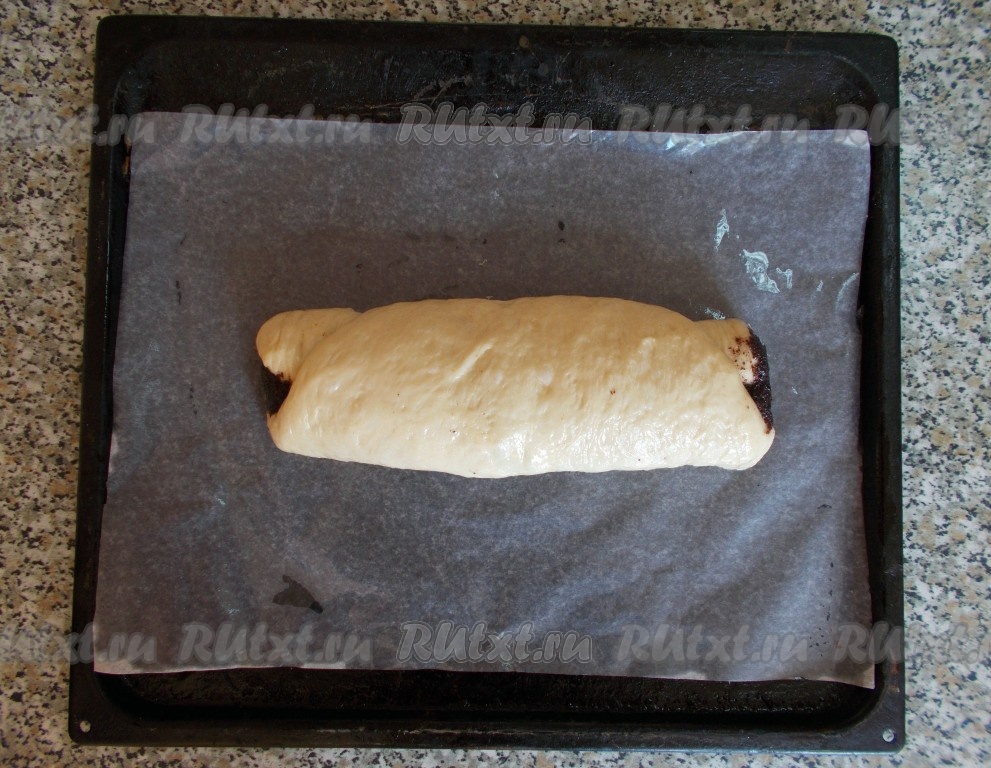 Выкладываем наш рулет на противень, застеленный бумагой для выпечки (дополнительно бумагу смазываем растительным маслом). Сверху рулет тоже прикрываем бумагой и ставим в теплое место на 20 минут, чтобы он увеличился в объеме (поднялся). Затем смазываем маковый рулет взбитым желтком и посыпаем сухим маком. Отправляем выпекаться рулет с маковой начинкой в разогретую до 180 градусов духовку на 30-40 минут.