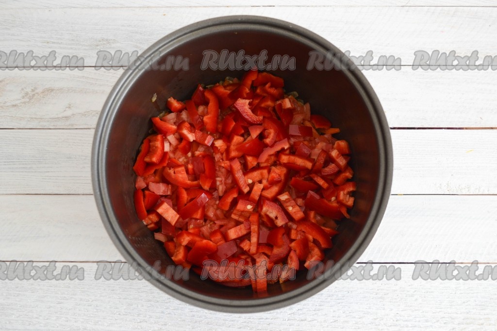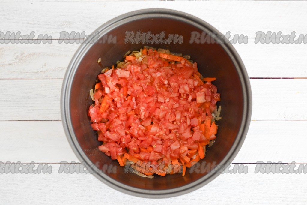 На помидорах сделать крестовые надрезы, обдать их кипятком, снять кожицу. Очищенные помидоры нарезать мелкими кубиками (можно перемолоть мясорубкой или блендером) и выложить в чашу мультиварки к луку и морковке.
