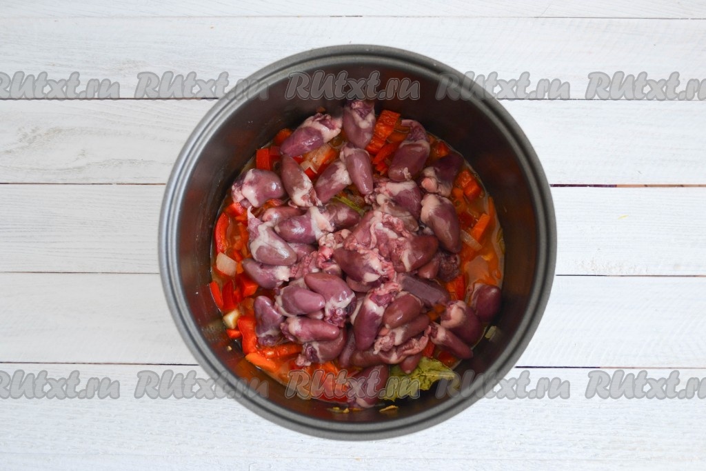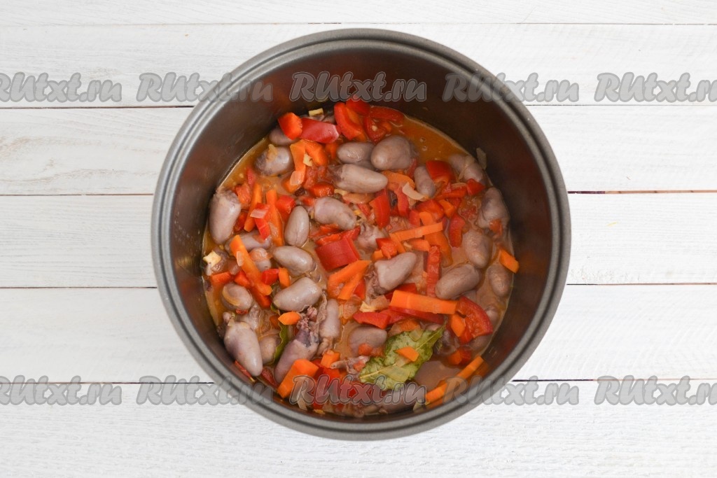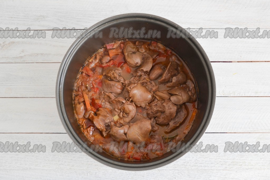 Закрыть крышку мультиварки и продолжить тушение куриных сердечек и печени еще 15 минут.