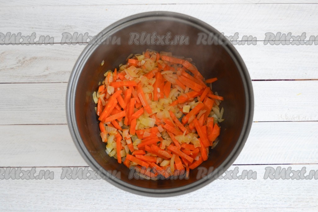 Включить мультиварку на функцию "Жарка" и влить растительное масло. Лук и морковь очистить. Лук нарезать мелкими кубиками, а морковь - соломкой. Всыпать морковку и лук в чашу мультиварки, обжарить до состояния мягкости (в течение 3-4 минут), иногда помешивая.