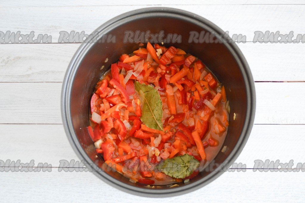 По вкусу всыпать соль, черный молотый перец и выложить лавровые листики, влить воду, переключить мультиварку на функцию "Тушение".