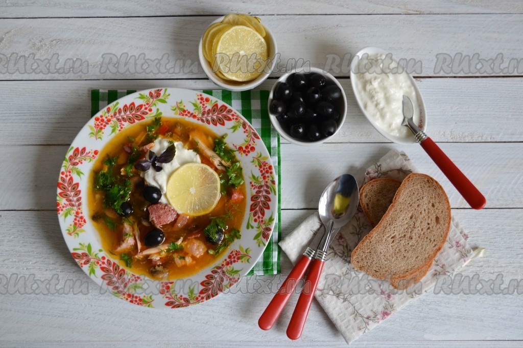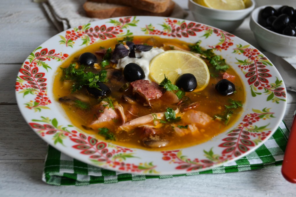 Перед подачей обязательно положить в тарелку ложку сметаны, ломтик лимона, измельченную зелень и оливки.
