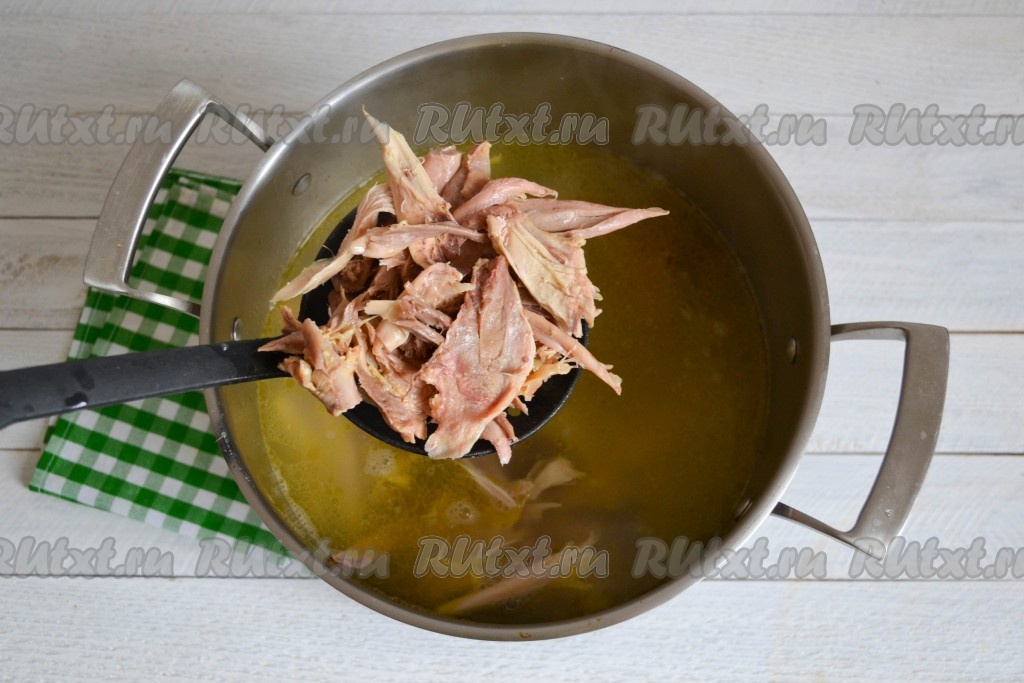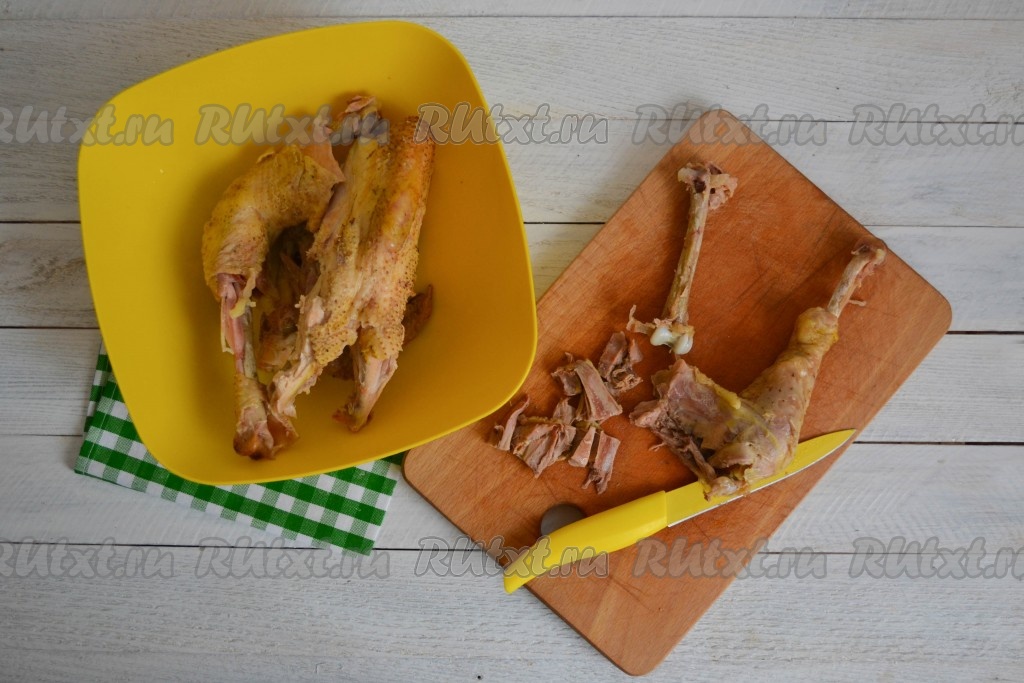 По окончании приготовления вынуть курицу, дать ей остыть и разобрать на части. Затем аккуратно отделить мясо от костей, разрезать его на части или разделить руками на небольшие волокна. Кости выбросить.
