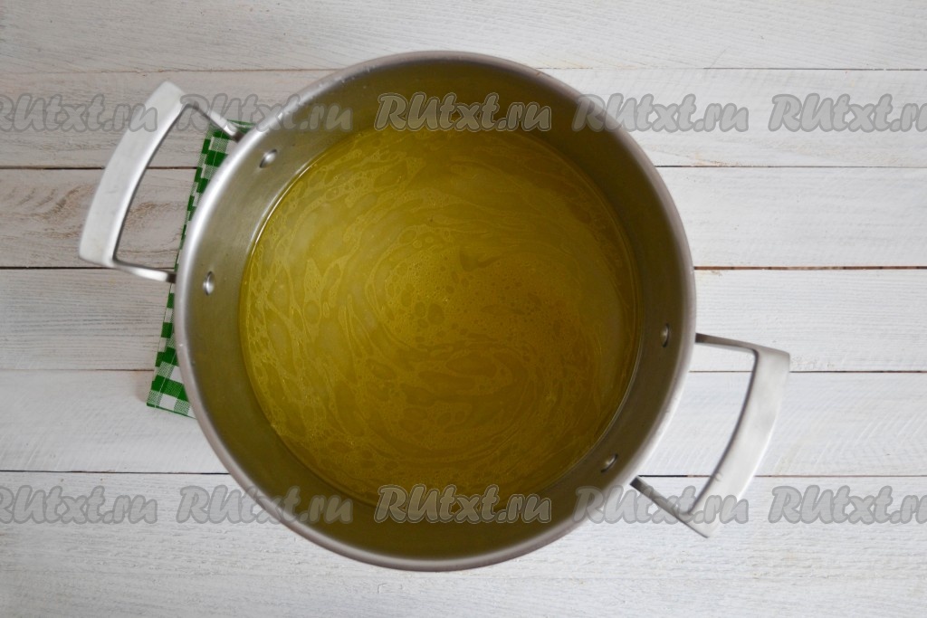 Бульон процедить через мелкое сито. Затем дать ему постоять минут 10-15 и очень аккуратно, не взбалтывая, процедить еще раз, но не до конца, буквально 30-40 мл оставшегося бульона с осадком вылить. Кастрюлю со светлым, насыщенным бульоном вернуть на огонь.
