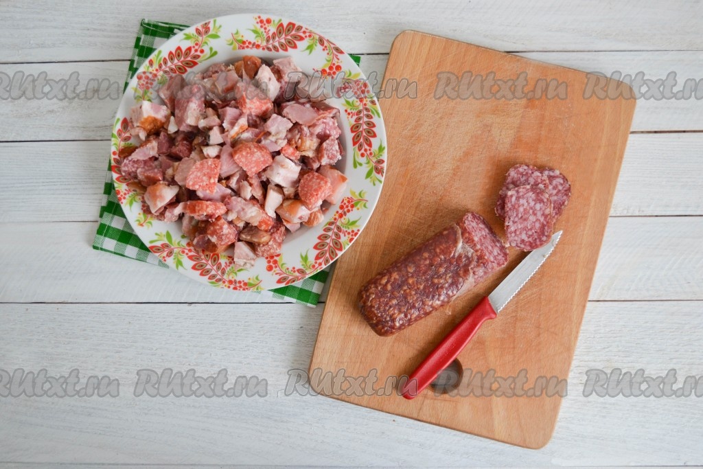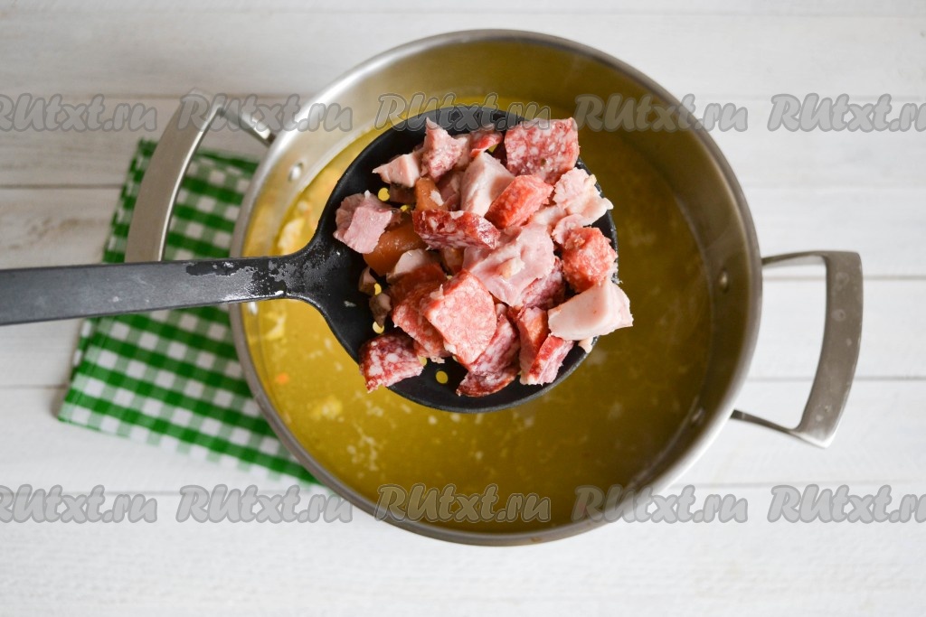 Выложить нарезанную колбасу сразу же за мясом в кастрюлю.