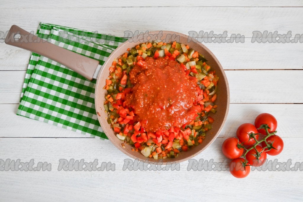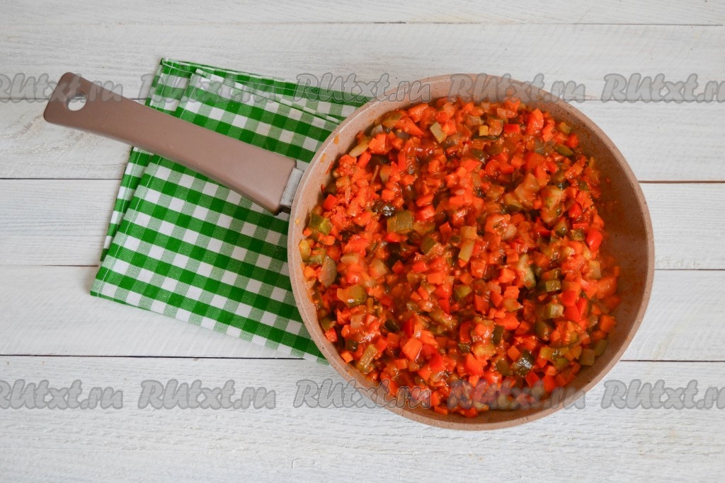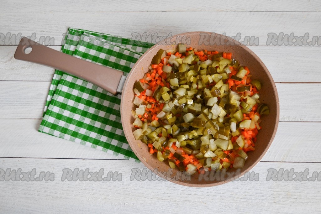 Соленые огурцы нарезать мелкими кубиками, выложить к обжаренным овощам. Помешивая, обжарить на среднем огне до полного испарения жидкости.