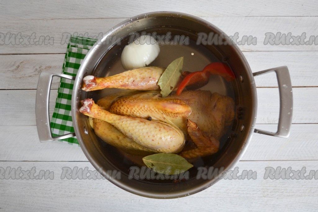 В большую кастрюлю выложить курицу. Ее можно разрезать на части или варить целиком, а разрезать на части уже после ее приготовления. Залить курицу полностью водой и выложить 1 очищенный репчатый лук, половинку сладкого перца без семян и плодоножки, 1 очищенную морковь, лавровые листики и горошины душистого перца. Поставить кастрюлю на огонь. В момент закипания снизить огонь к минимуму и снять образовавшуюся пену. Накрыть кастрюлю крышкой и варить куриное мясо до готовности. Бульон вместе с курицей должен слабо томиться, ни в коем случае не должен сильно кипеть! Я использовала домашнюю молодую курицу и варила ее 1 час. Если вы будете варить покупную курочку, то 40-45 минут будет достаточно.