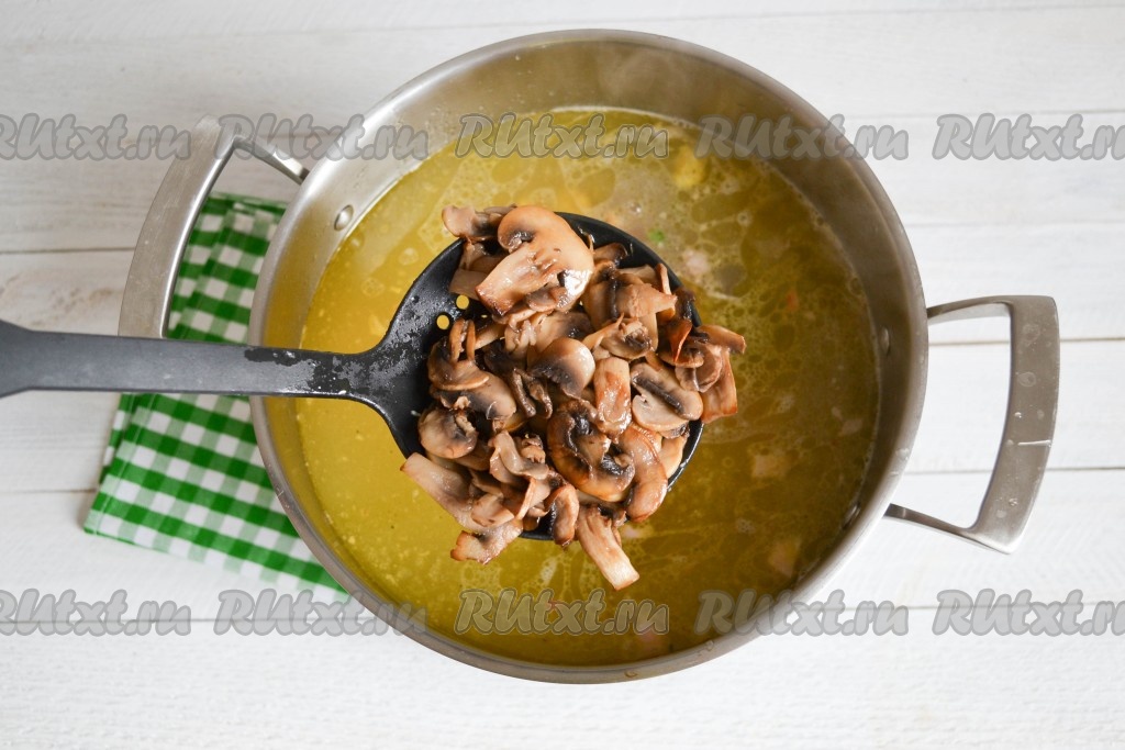 Грибы выложить в кастрюлю сразу же за колбасой.