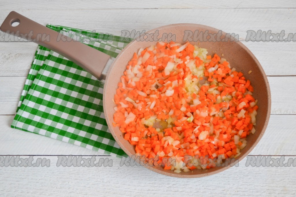 1 очищенную луковицу и 1 очищенную морковь нарезать мелкими кубиками и обжарить в течение 2-3 минут на растительном масле, помешивая. Лук должен стать мягким и прозрачным.