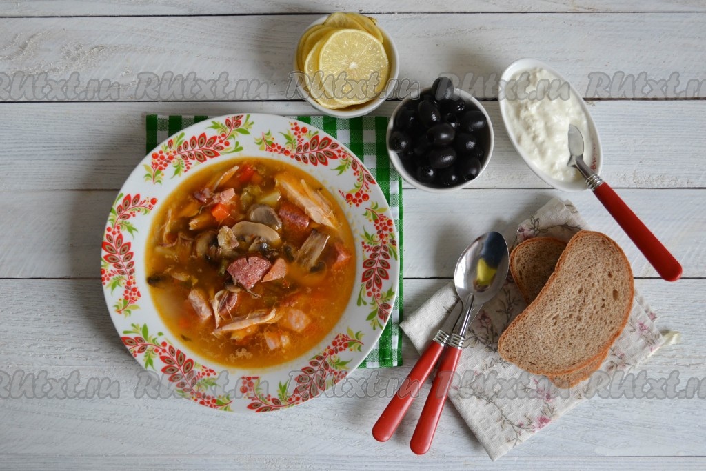 Солянка с курицей, колбасой и грибами невероятно вкусная! Существуют мнение, что солянка - блюдо мужчин. Ну не знаю, я и дети её просто обожаем!