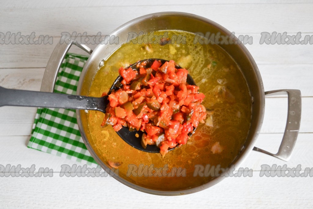 Сладкий перец вымыть, очистить от семян и плодоножки (1 половинку перца отложить в сторону, она нам понадобится для варки бульона), нарезать мелкими кубиками и выложить в сковороду к обжаренным овощам. Помидоры перемолоть мясорубкой или блендером, добавить на сковороду, перемешать и тушить на слабом огне 7-10 минут, периодически помешивая.