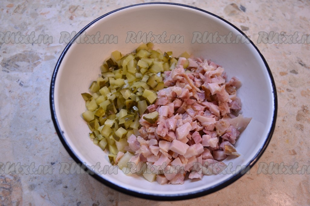 Куриное мясо нарезать маленькими кусочками и добавить к картофелю вместе с нарезанными маленькими кубиками маринованными огурцами.