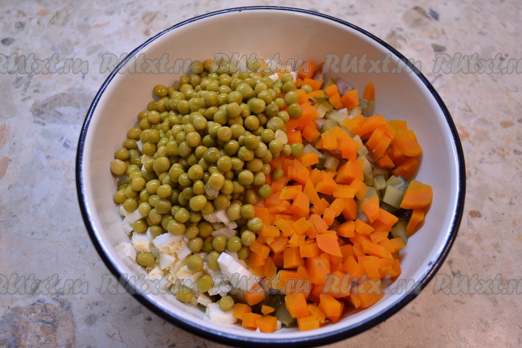 Отварную морковь, яйца очистить и тоже нарезать кубиками, добавить в салат вместе с консервированным горошком (без жидкости).