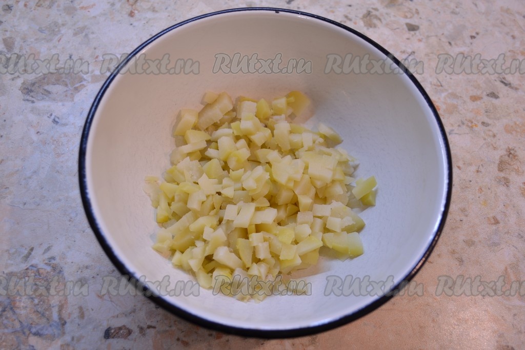 Картофель, сваренный в кожуре, очистить и нарезать небольшими кубиками.