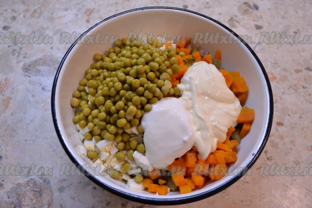 Салат немного посолить, добавить сметану и майонез.