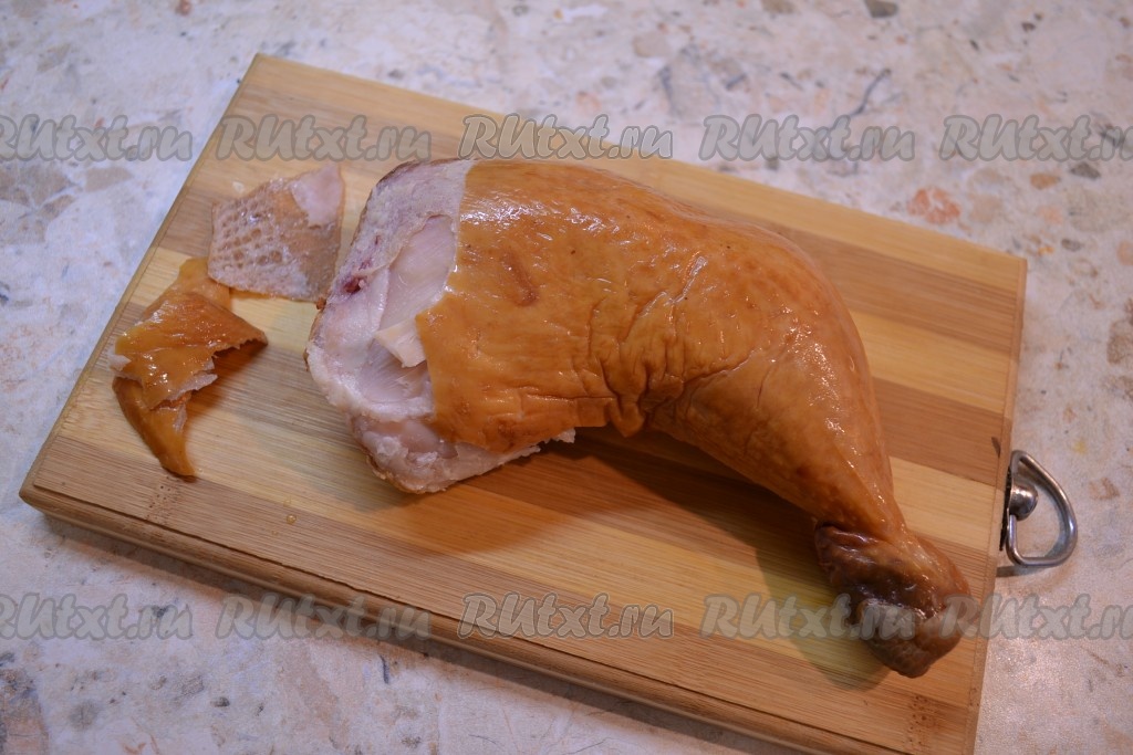 Окорочок копченый очистить от шкуры, мясо отделить от костей.